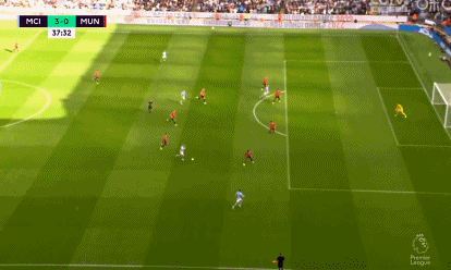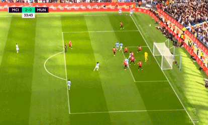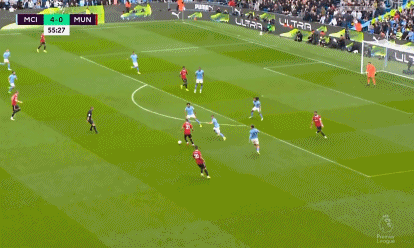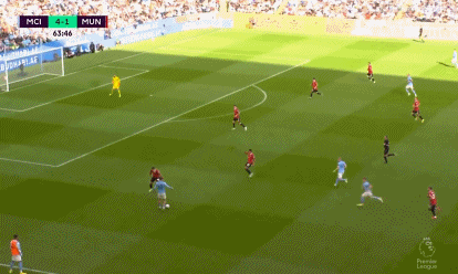 第37分钟,阿克中场长传,德布劳内持球推进来到外围右侧后挑传禁区,哈兰德左侧插上倒地左脚捅射破门实现梅开二度,曼城再度改写比分,3-0!第41分钟,两队均遭遇伤病问题,瓦拉内受伤被林德洛夫换下,戈麦斯则出场顶替受伤的沃克。第43分钟,德布劳内前场中路分球,哈兰德带球突入禁区左侧后横扫中路,福登快速接应右脚撞射入网实现梅开二度,曼城再下一城,4-0!上半场比赛结束,曼城4-0暂时领先曼联。