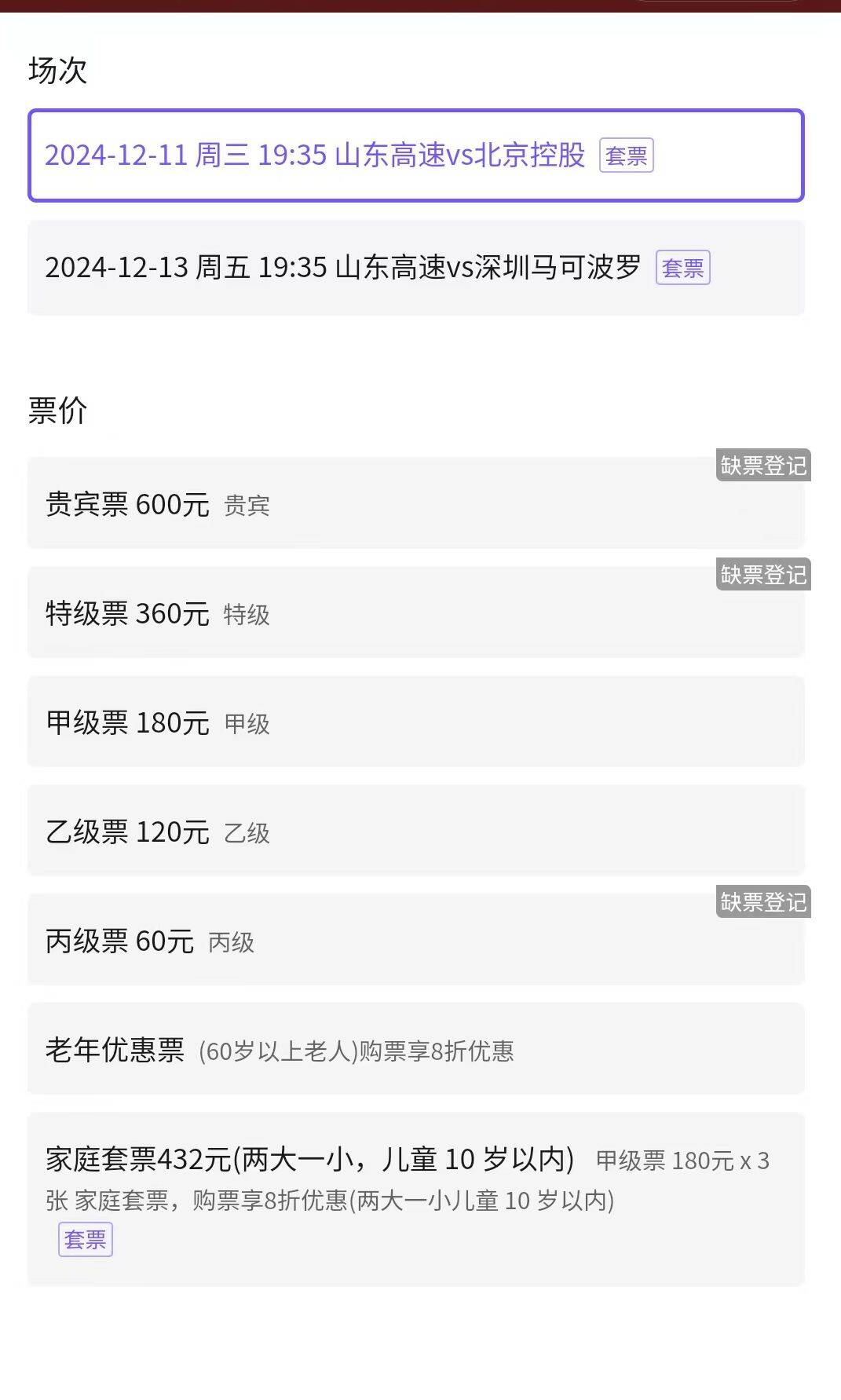 目前,山东高速男篮的主场球票仅通过线上渠道开放购买,而线下的购票渠道已被取消。记者在线上了解到,根据票星球小程序显示,对阵北控的比赛贵宾票、特价票和丙级票早已售罄,而仅剩的的甲级票(180元)和乙级票(120元)两种球票的数量也在急剧减少。